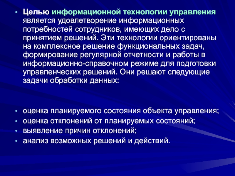 Слайд 94Целью информационной технологии управления является удовлетворение информационных потребностей сотрудников, имеющих