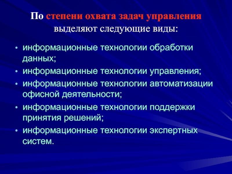 Слайд 92По степени охвата задач управления выделяют следующие виды: