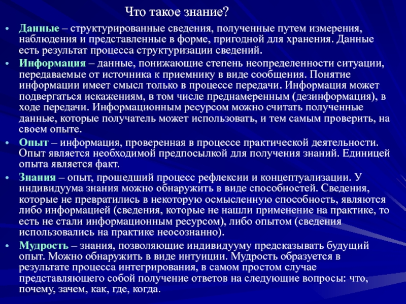 Знания – опыт, прошедший процесс рефлексии и концептуализации. У индивидуума знания можно обнаружить в виде способностей. Сведения, которые не превратились в некоторую осмысленную способность, являются либо информацией (сведения, которые не нашли применение на практике, то есть не стали информационным ресурсом), либо опытом (сведения использовались на практике неосознанно).
