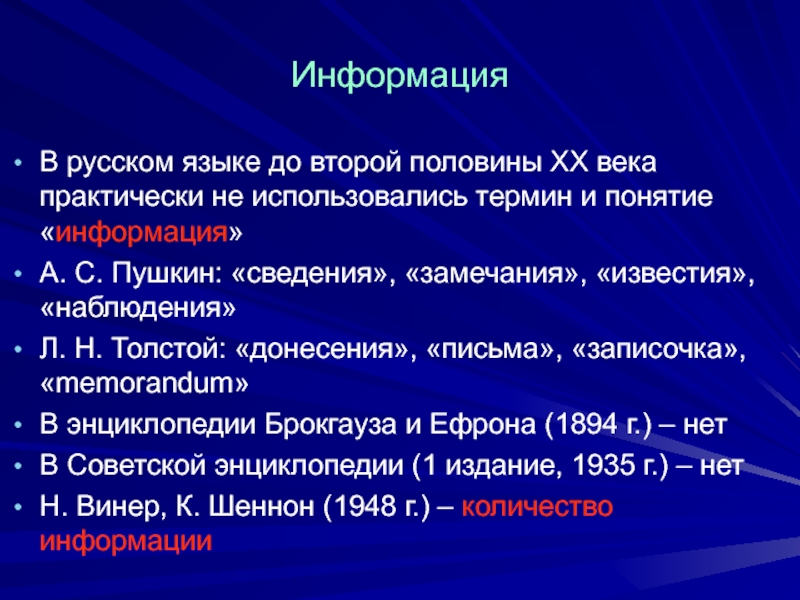 использовались термин и понятие «информация»