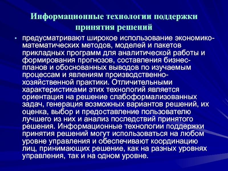 составления бизнес-планов и обоснованных выводов по изучаемым процессам и явлениям производственно-хозяйственной практики. Отличительными характеристиками этих технологий является ориентация на решение слабоформализованных задач, генерация возможных вариантов решений, их оценка, выбор и предоставление пользователю лучшего из них и анализ последствий принятого решения. Информационные технологии поддержки принятия решений могут использоваться на любом уровне управления и обеспечивают координацию лиц, принимающих решение, как на разных уровнях управления, так и на одном уровне.