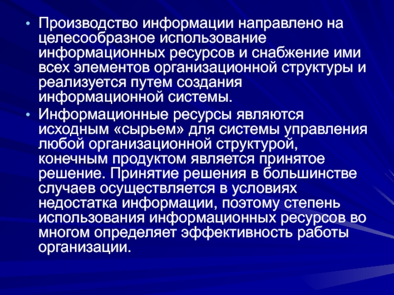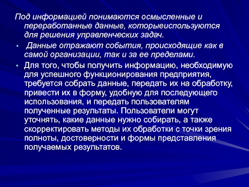 Информация – данные, понижающие степень неопределенности ситуации, передаваемые от источника к приемнику в виде сообщения. Понятие информации имеет смысл только в процессе передачи. Информация может подвергаться искажениям, в том числе преднамеренным (дезинформация), в ходе передачи. Информационным ресурсом можно считать полученные данные, которые получатель может использовать, и тем самым проверить, на своем опыте.