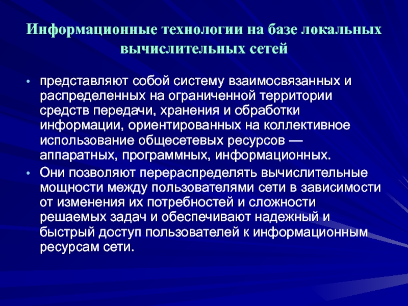 Они позволяют перераспределять вычислительные мощности между пользователями сети в зависимости от изменения их потребностей и сложности решаемых задач и обеспечивают надежный и быстрый доступ пользователей к информационным ресурсам сети.