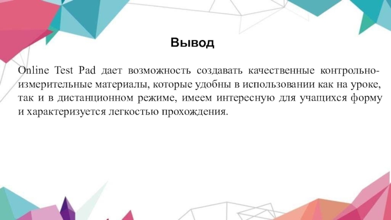 ВыводOnline Test Pad дает возможность создавать качественные контрольно-измерительные материалы, которые удобны в использовании как на уроке, так