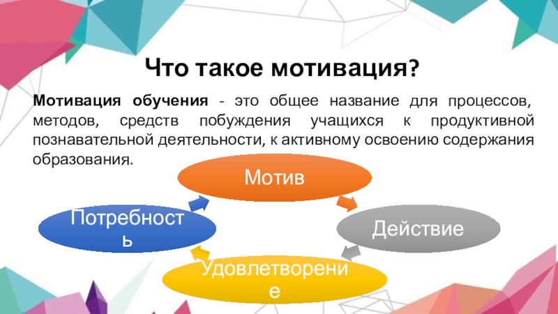 Что такое мотивация? Мотивация обучения - это общее название для процессов, методов, средств побуждения учащихся к продуктивной познавательной деятельности, к активному освоению содержания образования.