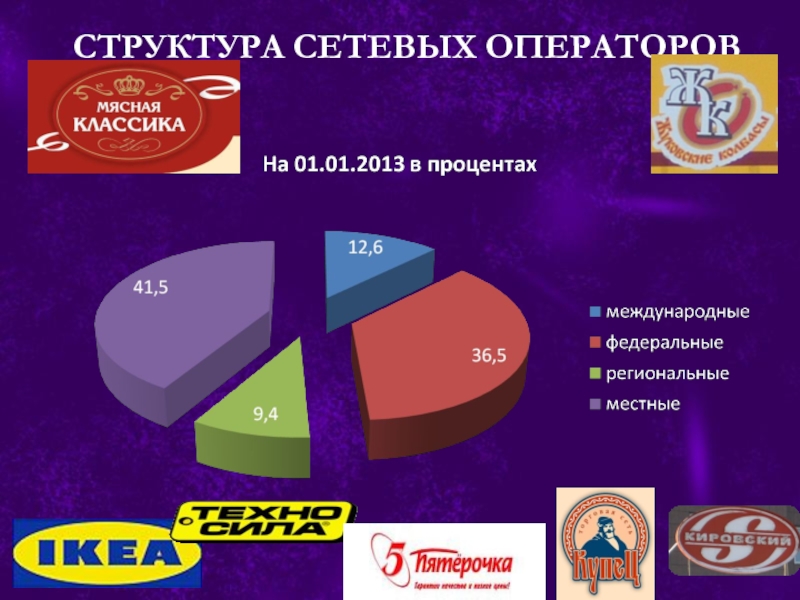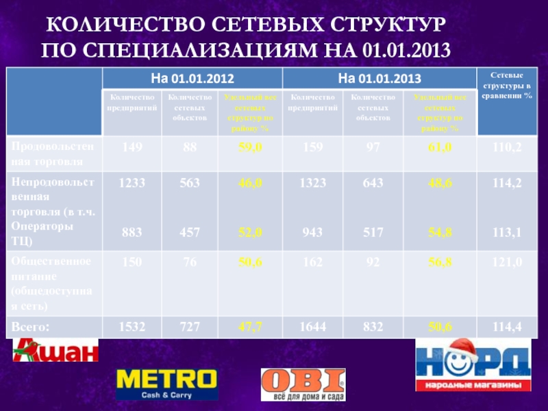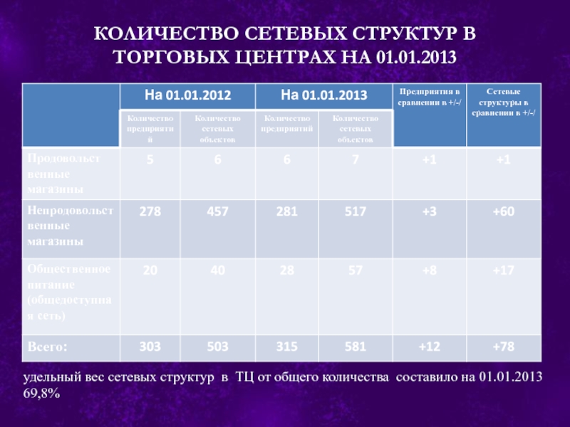 Слайд 24Количество сетевых структур в торговых центрах на 01.01.2013