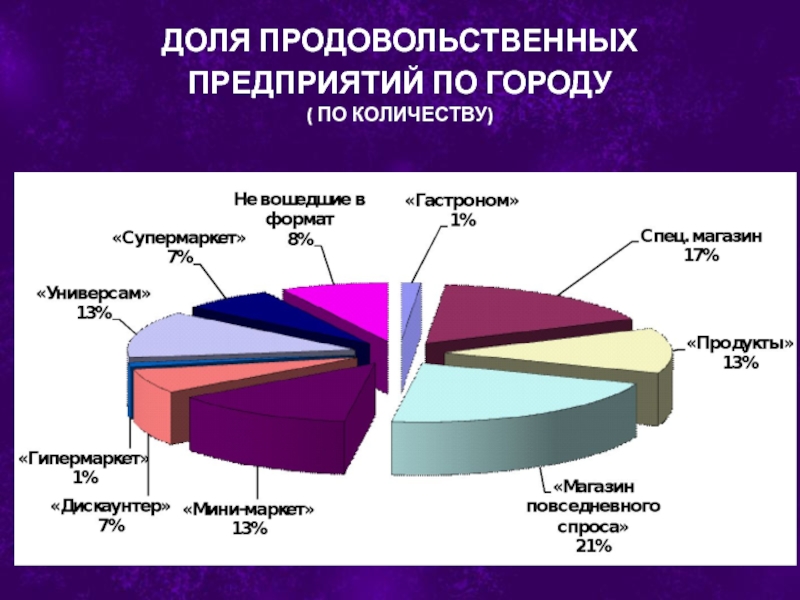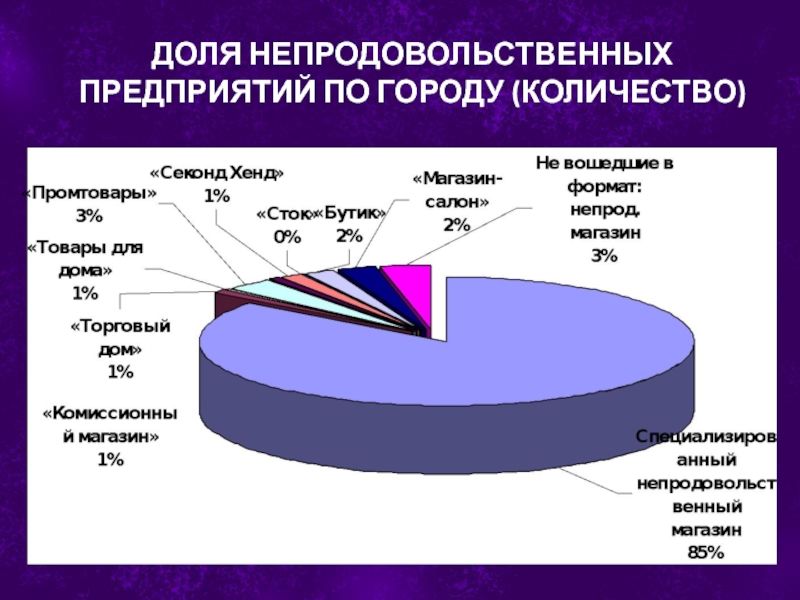 Слайд 31Доля непродовольственных предприятий по городу (количество)