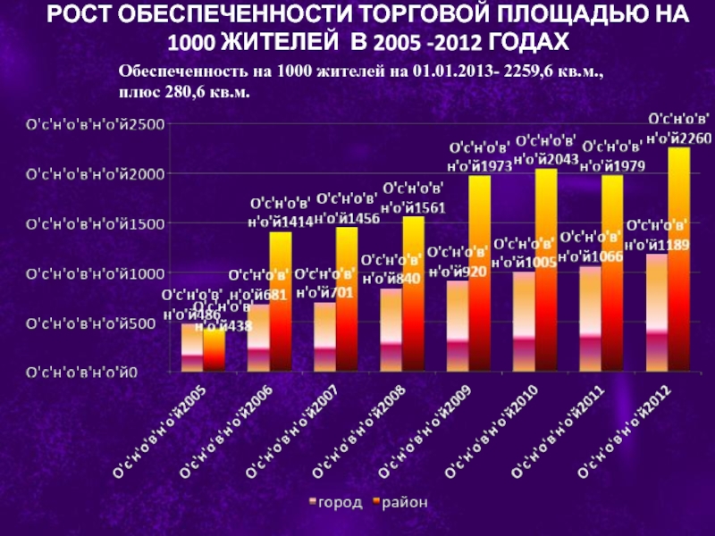 Обеспеченность на 1000 жителей на 01.01.2013- 2259,6 кв.м.,