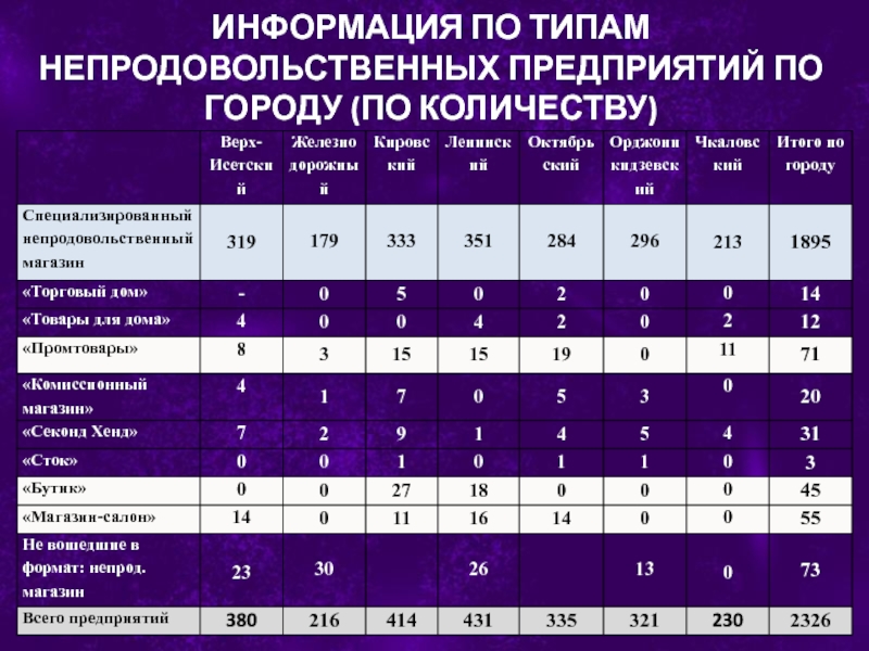 Слайд 30Информация по типам непродовольственных предприятий по городу (по количеству)