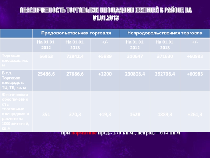 Слайд 21Обеспеченность торговыми площадями жителей в районе на 01.01.2013