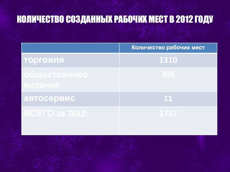 Слайд 20Количество созданных рабочих мест в 2012 году