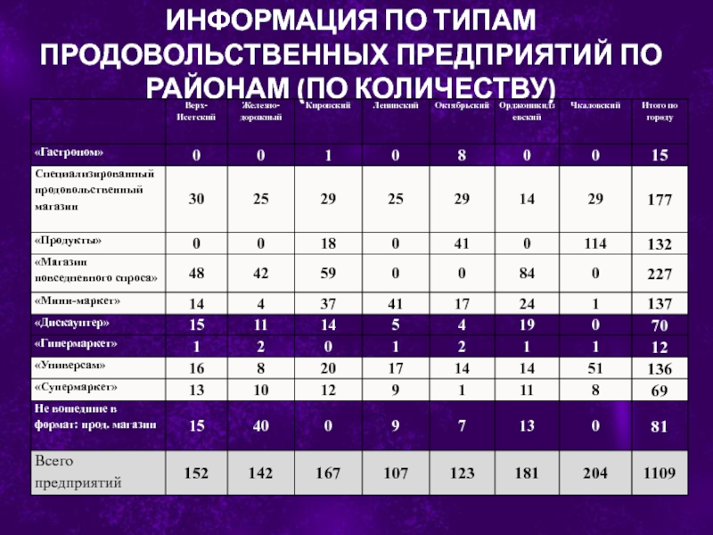 Слайд 28Информация по типам продовольственных предприятий по районам (по количеству)