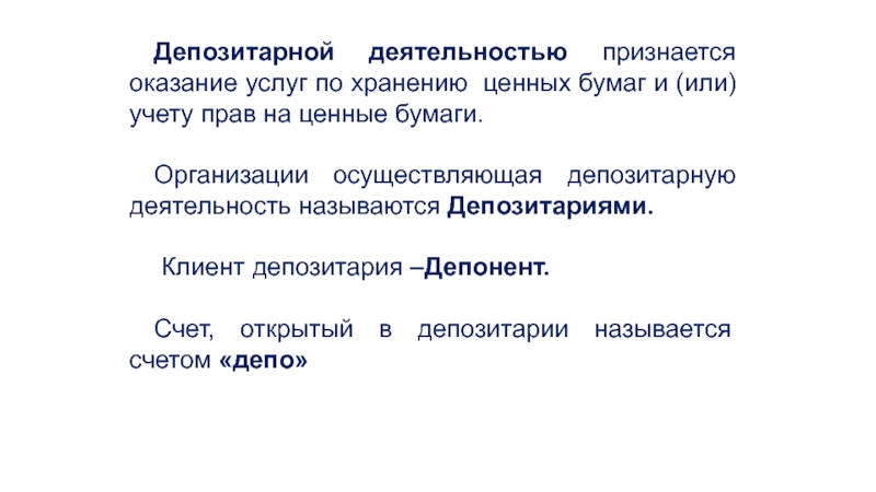 Слайд 28Депозитарной деятельностью признается оказание услуг по хранению ценных бумаг и