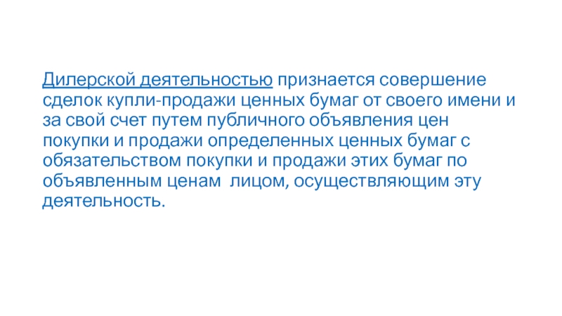 Слайд 8Дилерской деятельностью признается совершение сделок купли-продажи ценных бумаг от своего