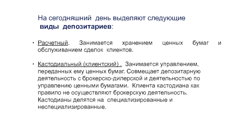 переданных ему ценных бумаг. Совмещает депозитарную деятельность с брокерско-дилерской и деятельностью по управлению ценными бумагами. Клиента кастодиана как правило не осуществляют брокерскую деятельность. Кастодианы делятся на специализированные и неспециализированные.