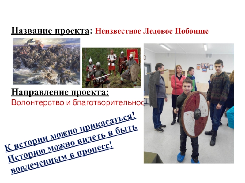 Название проекта: Неизвестное Ледовое ПобоищеНаправление проекта:Волонтерство и благотворительностьК истории можно прикасаться! Историю можно видеть и быть вовлеченным