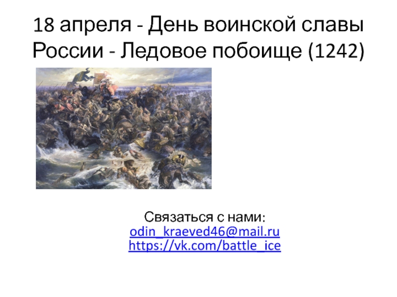18 апреля - День воинской славы России - Ледовое побоище (1242)Связаться с нами:odin_kraeved46@mail.ruhttps://vk.com/battle_ice