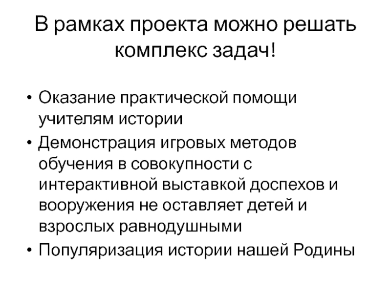 В рамках проекта можно решать комплекс задач!Оказание практической помощи учителям историиДемонстрация игровых методов обучения в совокупности с