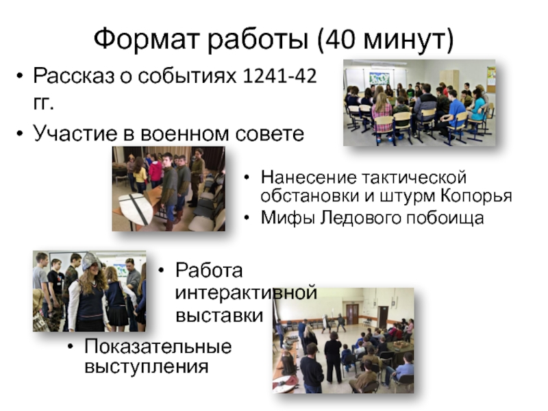 Формат работы (40 минут)Показательные выступленияРассказ о событиях 1241-42 гг.Участие в военном советеНанесение тактической обстановки и штурм КопорьяМифы