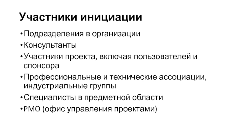 Участники инициацииПодразделения в организацииКонсультантыУчастники проекта, включая пользователей и спонсораПрофессиональные и технические ассоциации, индустриальные группыСпециалисты в предметной областиPMO