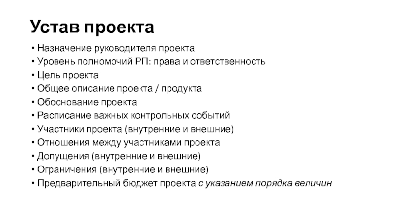 Устав проектаНазначение руководителя проектаУровень полномочий РП: права и ответственностьЦель проектаОбщее описание проекта / продуктаОбоснование проектаРасписание важных контрольных