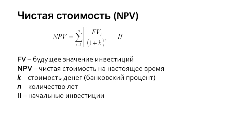 Чистая стоимость (NPV)FV – будущее значение инвестицийNPV – чистая стоимость на настоящее времяk – стоимость денег (банковский