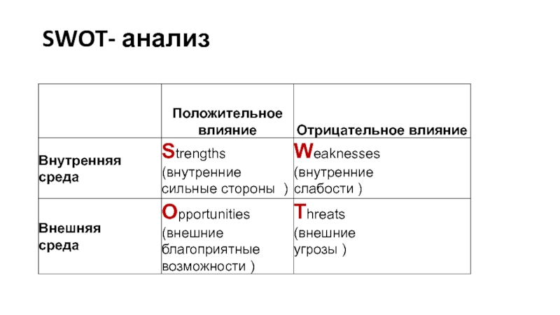 Проекты из SWOT-анализаSO – использование сильных стороны для увеличения возможностей компанииWO –преодолеваем слабые стороны и используя представленные