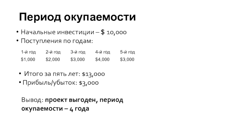 Период окупаемости Начальные инвестиции – $ 10,000 Поступления по годам: Итого за пять лет: $13,000 Прибыль/убыток: $3,000Вывод: