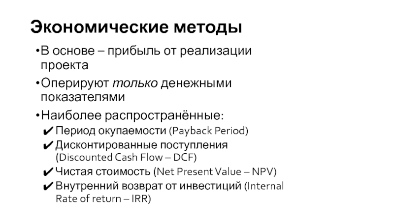 Экономические методыВ основе – прибыль от реализации проектаОперируют только денежными показателямиНаиболее распространённые:Период окупаемости (Payback Period)Дисконтированные поступления (Discounted