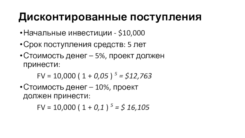 Дисконтированные поступленияНачальные инвестиции - $10,000Срок поступления средств: 5 летСтоимость денег – 5%, проект должен принести:		FV = 10,000
