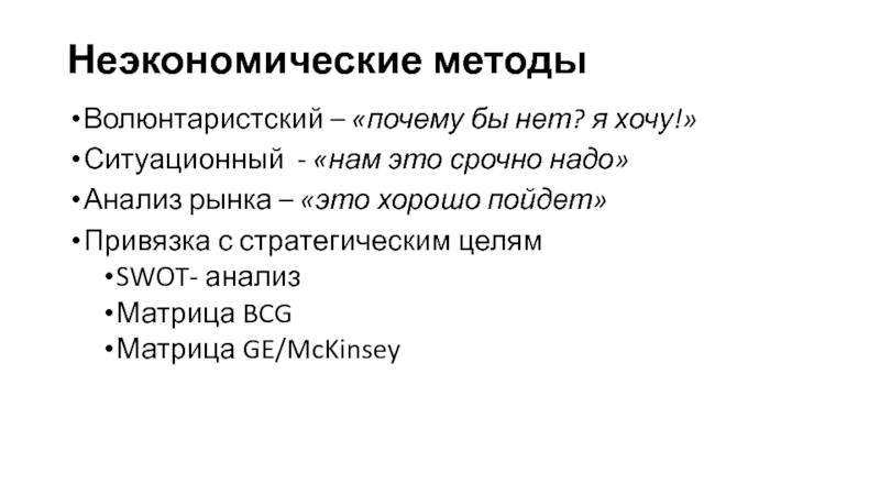 Неэкономические методыВолюнтаристский – «почему бы нет? я хочу!»Ситуационный - «нам это срочно надо»Анализ рынка – «это хорошо