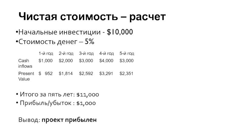 Чистая стоимость – расчетНачальные инвестиции - $10,000Стоимость денег – 5% Итого за пять лет: $11,000 Прибыль/убыток :
