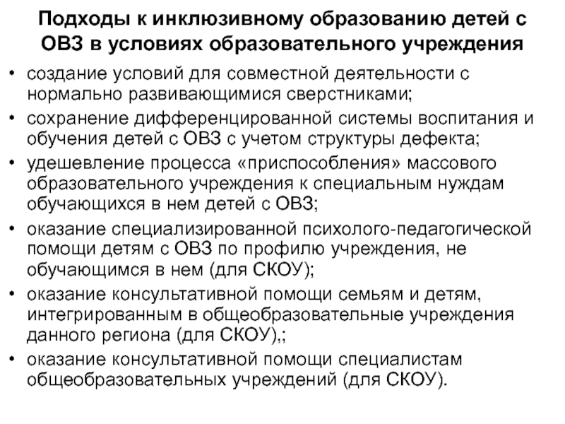 Основной принцип инклюзивного ОУ - все дети должны обучаться совместно во всех случаях, когда это является возможным.