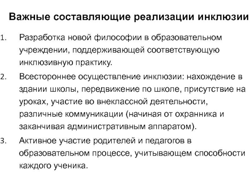 В рамках инклюзивных ОУ дети с особыми образовательными потребностями должны получать любую дополнительную помощь, которая может им потребоваться для обеспечения их эффективного образования