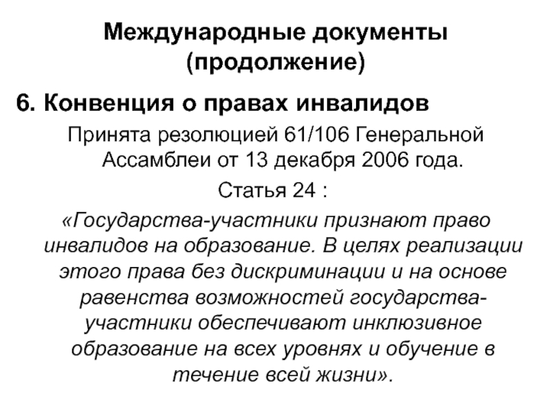 право инвалидов на образование. В целях реализации этого права без дискриминации и на основе равенства возможностей государства-участники обеспечивают инклюзивное образование на всех уровнях и обучение в течение всей жизни».