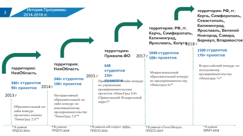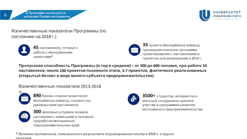 Пропускная способность Программы (в год в среднем) – от 300 до 600 человек, при работе 10 наставников, около 100 проектов посевного этапа, 3-7 проектов, фактически реализованных (открытый бизнес в виде малого субъекта предпринимательства).