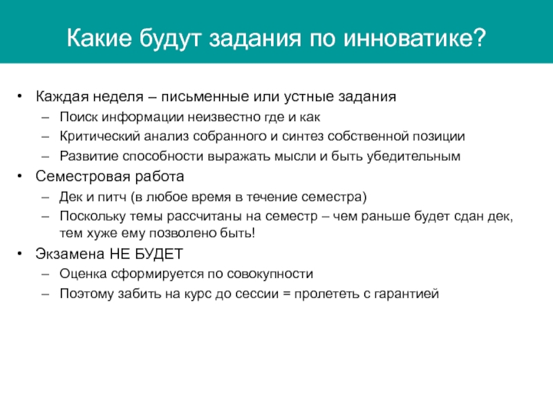 Поскольку темы рассчитаны на семестр – чем раньше будет сдан дек, тем хуже ему позволено быть!