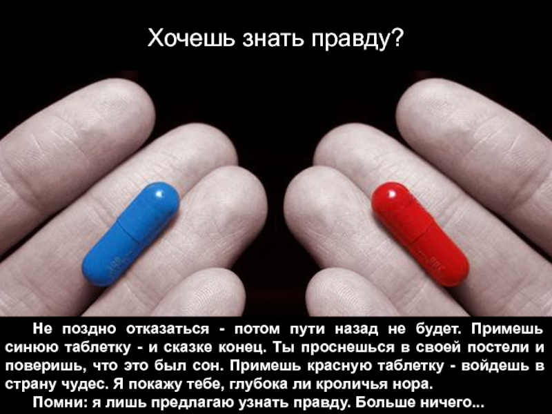 в своей постели и поверишь, что это был сон. Примешь красную таблетку - войдешь в страну чудес. Я покажу тебе, глубока ли кроличья нора.