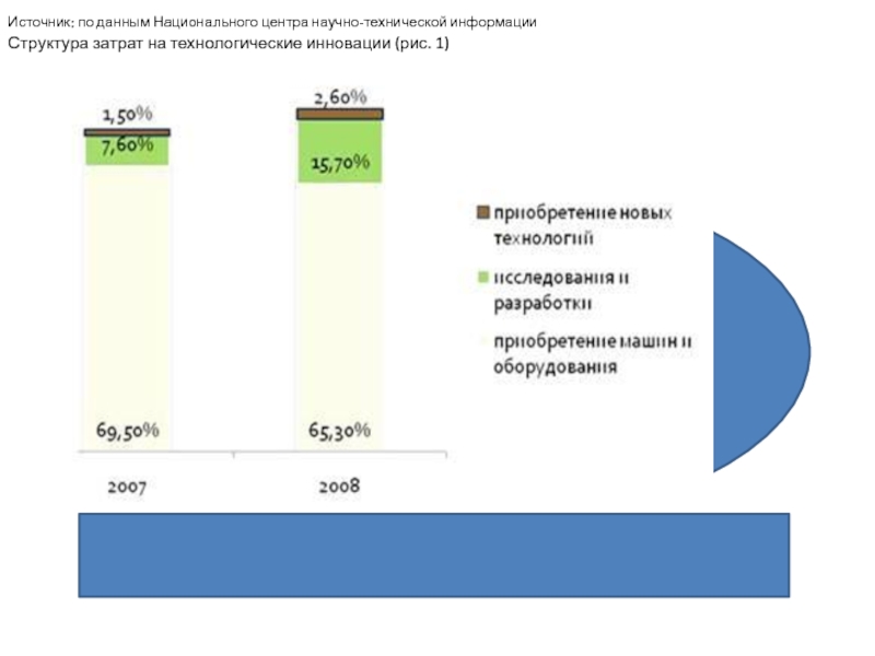 на приобретение машин и оборудования, связанных с технологическими инновациями составили 65,3%, на исследование и разработку новых продуктов, производственных процессов направлено – 15,7%, на приобретение новых технологий всего – 2,6%, что усиливает тенденцию к инновационной зависимости от промышленно развитых стран (рис. 2).