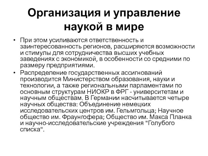 осуществляют большой объем работы (часть которой приходится на прикладные исследования) по контрактам под государственным надзором. В области фундаментальных исследований, которые обычно финансируются федеральным правительством через выделение грантов, доминируют университеты.