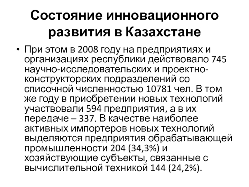 В 2008 году 447 хозяйствующих субъектов Казахстана имели технологические инновации из 11172 предприятий, на которых было проведено статистическое наблюдение инновационной деятельности (в 2007 году – 526 предприятий). По оценкам восприимчивости предприятий промышленности к инновационным процессам, которая характеризуется долей активных предприятий, инновационная активность предприятий Казахстана в 2008 году составила 4,0 %. Для сравнения: доля инновационно-активных предприятий в США составляет около 50%, Турции – 33, Венгрии – 47, в Эстонии – 36, в России -9,1%.