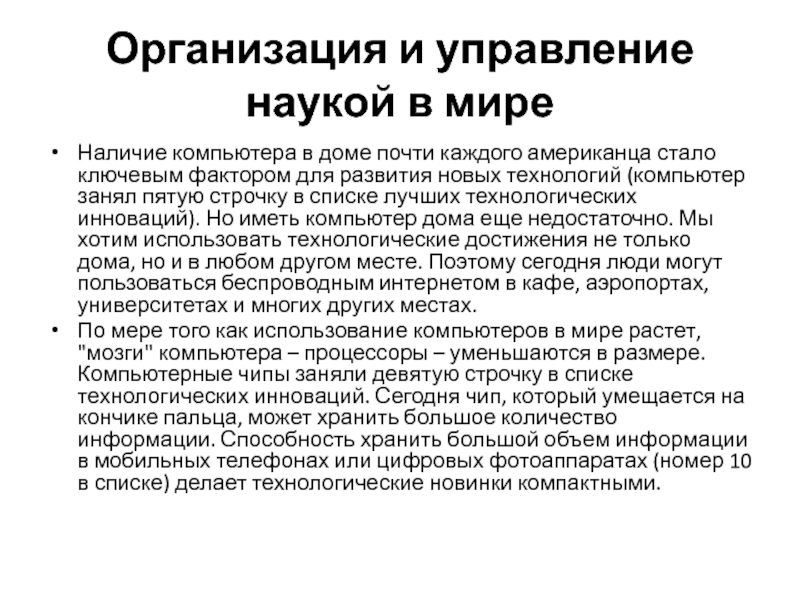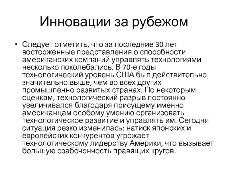70-е годы технологический уровень США был действительно значительно выше, чем во всех других промышленно развитых странах. По некоторым оценкам, технологический разрыв постоянно увеличивался благодаря присущему именно американцам особому умению организовать технологическое развитие и управлять им. Сегодня ситуация резко изменилась: натиск японских и европейских конкурентов угрожает технологическому лидерству Америки, что вызывает большую озабоченность правящих кругов.