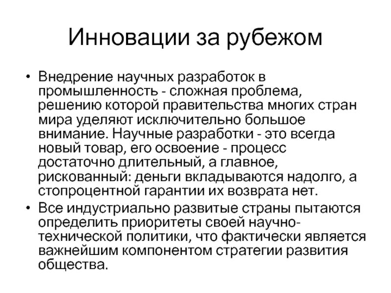 отсутствии собственной научной базы, опираясь на новейшие технологии, разработанные в других странах, приобретая патенты и лицензии, можно обеспечить 10-20% ежегодного прироста промышленного производства.
