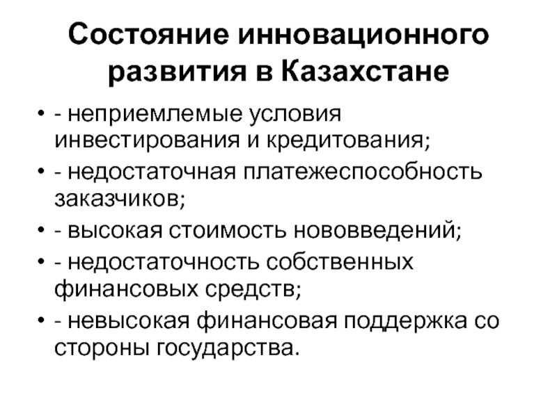 тем необходимо отметить, что инновационная деятельность в республике пока не является источником повышения конкурентоспособности страны на мировом рынке. Несмотря на положительный опыт целого ряда инициатив, заметного прорыва в области инновационного развития экономики страны не произошло. Одной из проблем инновационного развития в Казахстане на сегодняшний день является незавершенность научных исследований, их отрыв от производства. Проводимые прикладные разработки не имеют продолжения в виде коммерциализации и внедрения в производство.