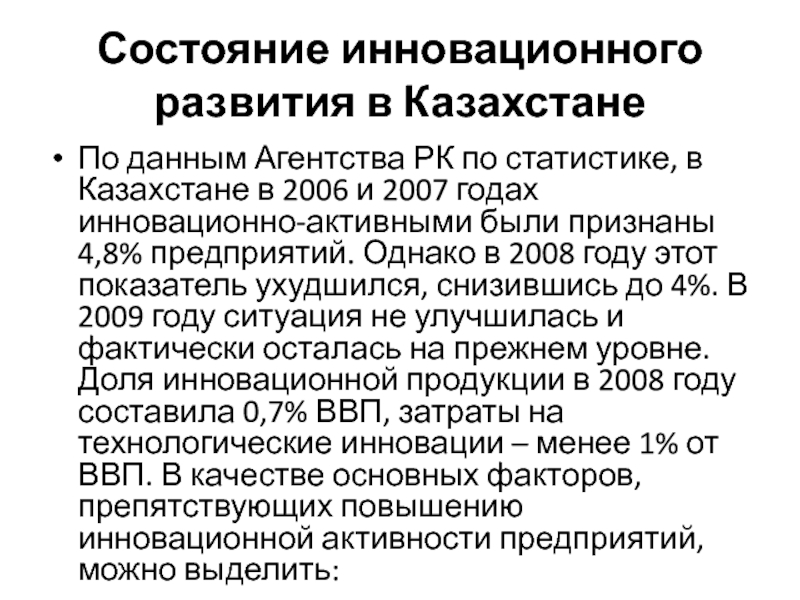4,8% предприятий. Однако в 2008 году этот показатель ухудшился, снизившись до 4%. В 2009 году ситуация не улучшилась и фактически осталась на прежнем уровне. Доля инновационной продукции в 2008 году составила 0,7% ВВП, затраты на технологические инновации – менее 1% от ВВП. В качестве основных факторов, препятствующих повышению инновационной активности предприятий, можно выделить: