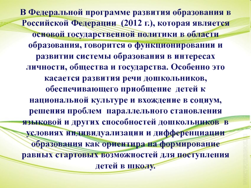 функционировании и развитии системы образования в интересах личности, общества и государства. Особенно это касается развития речи дошкольников, обеспечивающего приобщение детей к национальной культуре и вхождение в социум, решения проблем параллельного становления языковой и других способностей дошкольников в условиях индивидуализации и дифференциации образования как ориентира на формирование равных стартовых возможностей для поступления детей в школу.