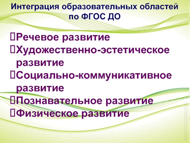 Интеграция образовательных областейпо ФГОС ДОРечевое развитиеХудожественно-эстетическое развитиеСоциально-коммуникативное развитиеПознавательное развитиеФизическое развитие
