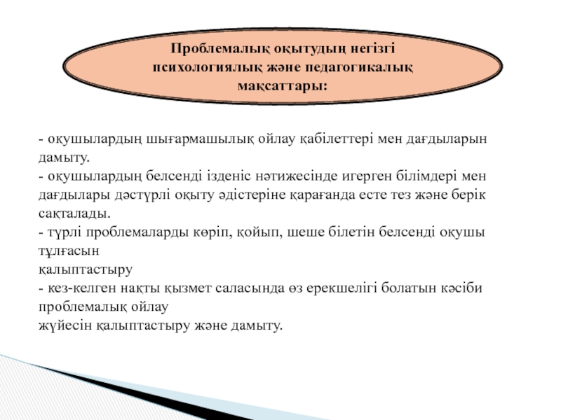 проблеманы шешу, шешімді тексеру. Бұл процесс ойлау актісінің үш фазасымен ұқсастық бойынша өрістейді (С.Л. Рубинштейн бойынша), ол проблемалық жағдайда пайда болып, проблеманы аңғаруды, оны шешуді және соңғы ой тұжырымын қамтиды.Проблемалық оқыту оқушылар үшін қиыншылық деңгейі бойынша әртүрлі болуы мүмкін, ол оның проблеманы шешу үшін қандай және қанша іс-әрекеттер жүзеге асырылатынына байланысты. В.А. Крутецкий оқушы мен мұғалімнің іс-әрекеттерін бөлу негізінде дәстүрлі оқытумен салыстыра отырып, оқытудың проблемалығы деңгейінің сызбасын ұсынды.