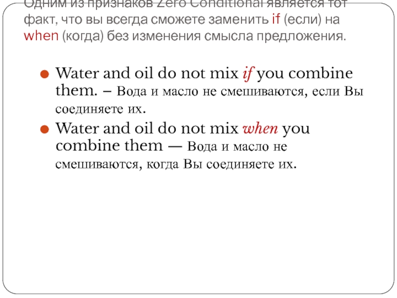 Water and oil do not mix when you combine them — Вода и масло не смешиваются, когда Вы соединяете их.
