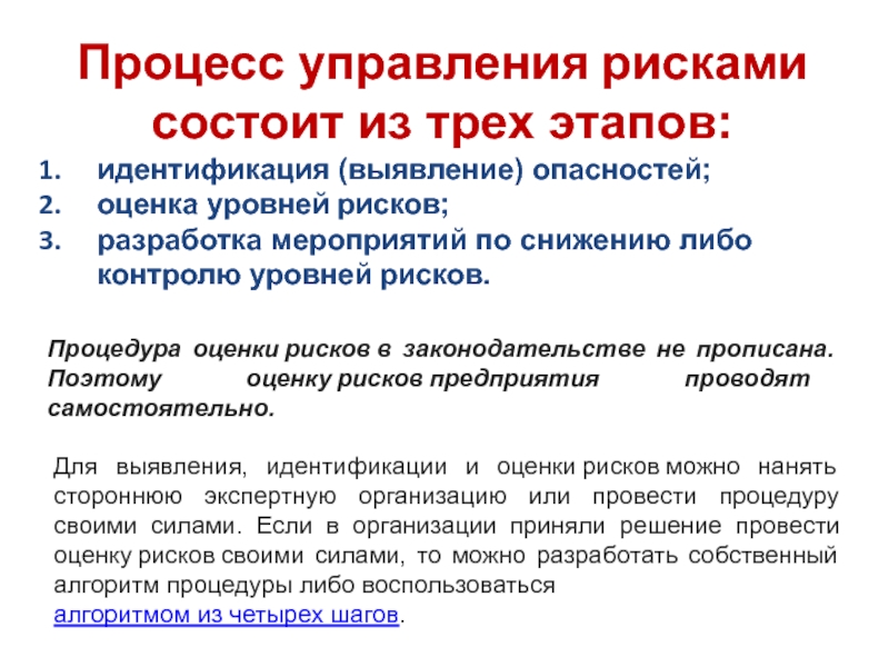 Для выявления, идентификации и оценки рисков можно нанять стороннюю экспертную организацию или провести процедуру своими силами. Если в организации приняли решение провести оценку рисков своими силами, то можно разработать собственный алгоритм процедуры либо воспользоваться